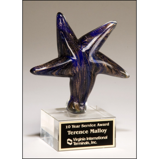 Blue and Metallic gold highlighted star shaped art glass award with clear base.