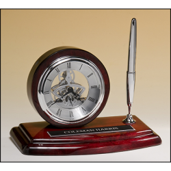 Skeleton clock, silver movement and pen with rosewood piano-finish case.